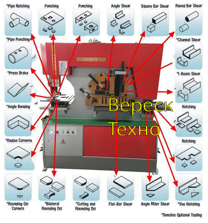 - Пробивка: доступен полный спектр универсальных пробивных штампов. Конструкция позволяет выполнять штамповку железа под большим углом и пробивать большие отверстия. Для простоты эксплуатации используется откидная конструкции съемника, большой стол с линейками и упором; стандартные фитинги; быстрая смена стяжной гайки и втулки для быстрой смены.