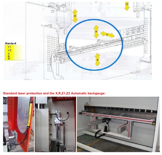 Ход задних упоров. Самая передовая электрогидравлическая синхронизирующая система сервоуправления с замкнутым контуром. Подходит для получения изделий, с большим количеством сгибаемых углов и высокой точностью. Перемещение оси X осуществляется за счёт ШВП, линейных направляющих и серводвигателя. Задние упоры обладают высокой прочностью и точностью перемещений. |