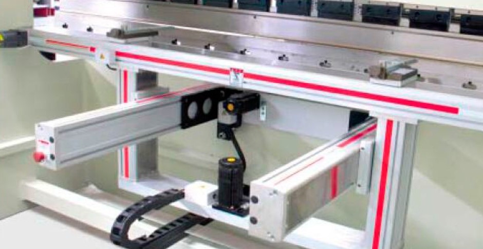 Синхронизация работы двух гидроцилиндров реализовано механической траверсой между ними. Привод, обеспечивающий перемещение задних упоров электромеханический, управление с пульта (контроллера) на лицевой стороне листогиба. Данный тип прессов прост в управления и настройке, за счёт применения многоручьевых матриц и различных пуансонов обеспечивают высокую универсальность применения в различных типах производств (мебель, металлоконструкции, электрошкафы, двери и т.д.).